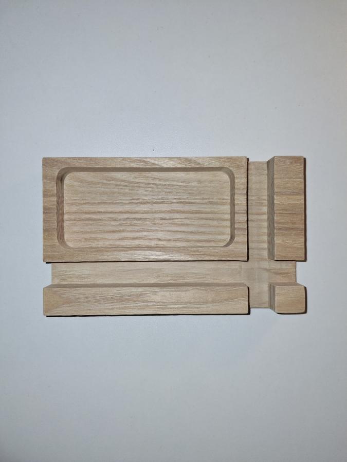 Деревянная подставка для телефона — стильный и функциональный аксессуар, который наведёт порядок на вашем столе. Два удобных углубления позволяют разместить телефон под разным углом, а специальное отделение идеально подойдёт для мелочей: скрепок, флешек, визиток и других нужных вещей. Натуральное дерево придаёт подставке тёплый, современный вид, а минималистичный дизайн гармонично впишется в любой интерьер. Идеально для дома и офиса. Ранее не использовалась. Телефон и флешка использованы в качестве примера, не продаются=)